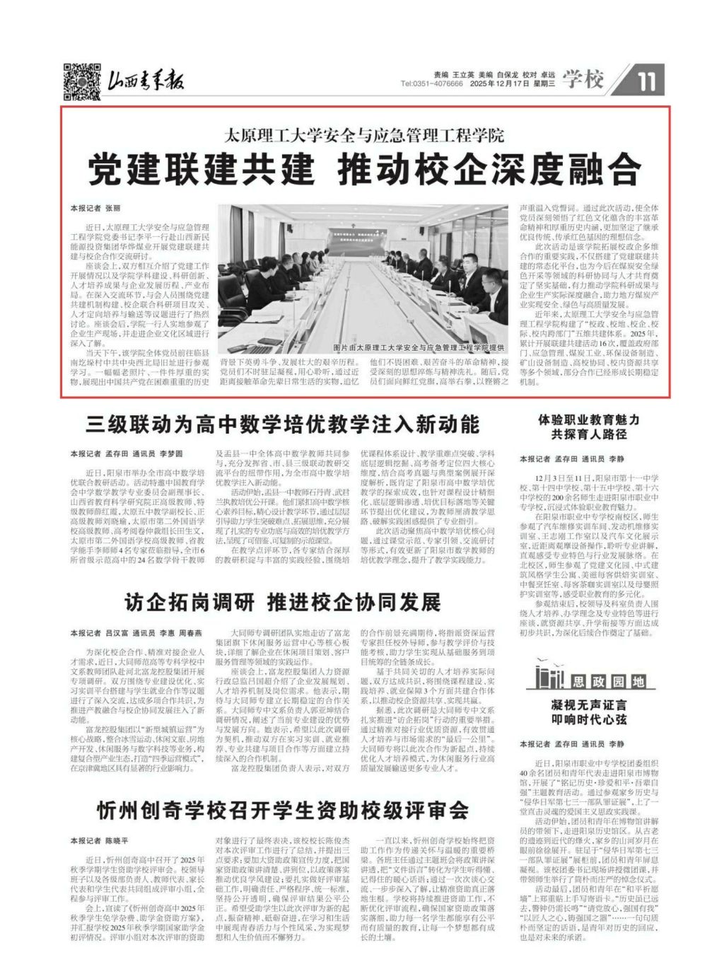 12月17日,《山西青年报》以《党建联建共建 推动校企深度融合》为题对我院党建工作进行深度报道。现将全文转载如下。