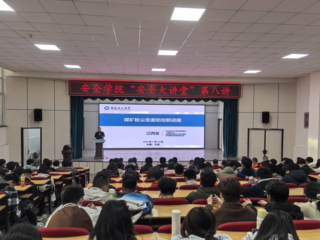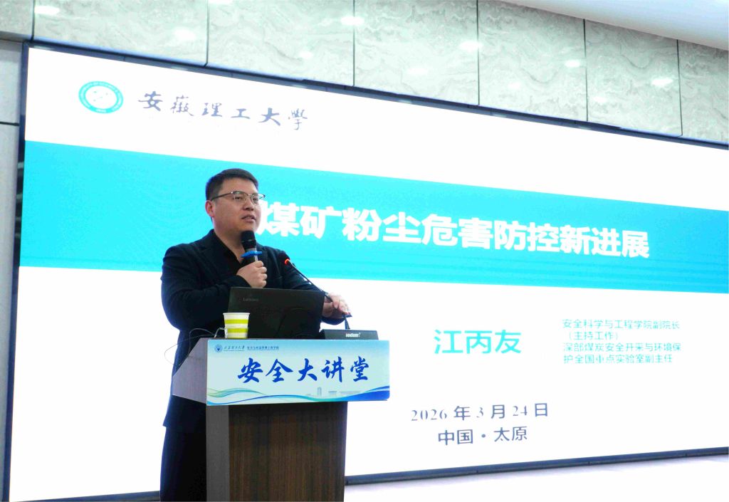 3 月 24 日下午,安全学院 “安全大讲堂” 第八期在学院一层报告厅开讲。安徽理工大学安全科学与工程学院副院长江丙友教授应邀作 “煤矿粉尘危害防控研究进展” 专题报告。学院院长杨威、党委副书记王利舟、副院长郭红光及百余名师生代表到场聆听。讲座由杨威主持。
