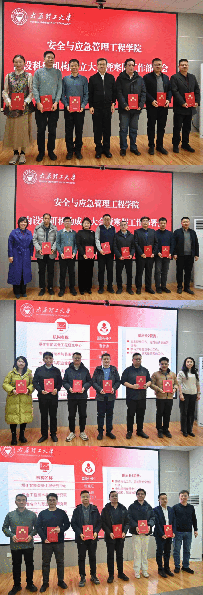 此次科研机构设立是安全学院顺应学科发展趋势、聚焦国家重大战略需求、优化学科布局、深化有组织科研的关键举措,它承载着学院提升创新能力、打造学术高地、服务社会发展的殷切期望,通过系统性重组,激发创新活力,提升科研水平,为学院科研人员提供一个更为聚焦、更富活力的学术平台与发展舞台。学院将以此次会议为新的起点,以七个科研机构与两个支撑平台为新支点,凝聚共识、聚焦方向,锐意进取、脚踏实地,全力推进有组织科研与学科内涵建设,为服务国家战略、助力山西转型发展和我校“双一流”建设贡献安全学科的智慧与力量。